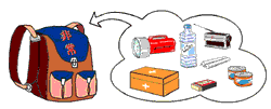 食料、飲料水、懐中電灯、ラジオ、ローソク、マッチ、貴重品、医薬品など非常持ち出し袋を常備しておきましょう。