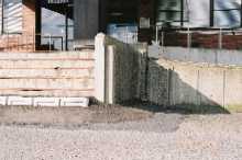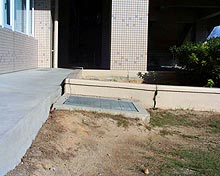 建物と外周構造物との不同沈下沈下により階段部分にブロックが継ぎ足しされ、新しい階段とされている。右側の斜路部擁壁には約30cmの沈下が生じている。