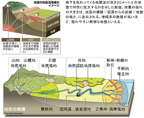 軟らかい地層で形成される浅部地盤は、河川下流に形成される後背湿地や三角州などの軟弱地盤です。河口付近に分布する干拓地や埋立地等は、造成された地形面であり自然地盤に比べて軟らかい状態なので、高い増幅率の地盤と評価され、揺れやすいといえます。