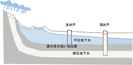地盤の中にある水が地下水で、不圧地下水と被圧地下水があります。一般に浅井戸でよく利用されているのが、河川の浸透水などが地下に浸透している不圧地下水です。扇状地性低地の砂礫地盤などに多く賦存しています。被圧地下水は洪積砂礫層や岩盤などの深部にあり、上部に透水性の低い加圧層があるため、上流の水圧を維持して被圧しています。深井戸で利用されます。いずれも、蒸発~降水~流下~浸透~流出~蒸発という地球規模の水循環のなかで、地下水が分布しています。