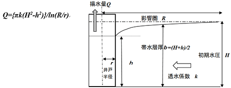 不圧地下水で適正な揚水量を算定するには、通常、下記の井戸公式が用いられます。その各項について、必要な調査と適用を示します。