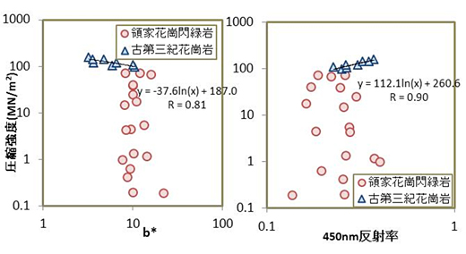図-2は岩石の色彩(b値)あるいは450nm付近の反射率と、圧縮強度の関係図である。強度が約100MN/m2以上と硬質な試料(古第三紀花崗岩)において、それぞれ良好な関係が認められる。分光測色によって、未風化硬質な岩石の強度特性の把握の可能性を示した例である。