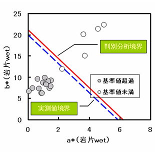 図-3は、セレンを環境基準値以上溶出する試料の判別図である。色彩値a*b*値の分布(分光測色)により、セレン溶出岩の判定がその場で瞬時に把握できる例である(a*b*値が、赤あるいは青線より左側に分布する試料はセレンを基準値以上溶出する岩)。