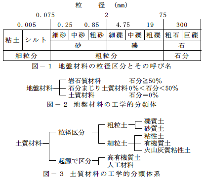 基本的な分類方法は、地盤工学では「地盤材料の工学的分類方法(地盤工学会基準:JGS 0051)」に基準化されている。地盤材料は図-1に示すように、粒径に応じて砂粒子(あるいは砂分)とか礫粒子(あるいは礫分)と表される。なお、土壌学や地学とは多少の違いがある。
