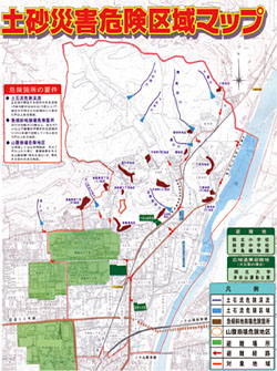 代表的なものとしては土砂災害ハザードマップがあります。これは、大雨や地震などにより発生するがけ崩れなど、土砂災害の恐れがある箇所を地図上に表示したものです。
