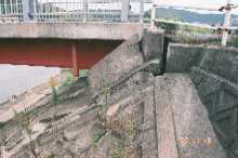 梁との取り付け部の沈下堤防部分が沈下しコンクリート壁や護岸ブロックに亀裂や変状が発生している。