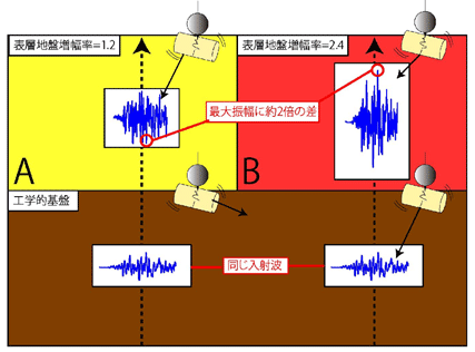 地震の揺れは、浅部地盤の固さより異なります。固さを示す指標として、表層地盤増幅率が用いられます。表層地盤増幅率は、軟らかい粘土層や緩い砂層からなる浅部地盤であれば、高い増幅率となります。図2では、Bの方が高い表層地盤増幅率であり、Aより軟らかい地層であると言えます。