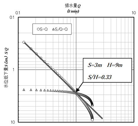 各指針の図表示では、日本水道協会の「水道施設設計指針2012」p.94では、h=0.4H程度、日本工業用水協会の「工業用水道施設設計指針・解説1989」p79では、h=0.5H程度で更に井戸効率C=0.5を乗じるとありました。そのため、図の解釈でh=0.4~0.5Hまで水位低下(S=H-h)させて良いと思われる方もいます。