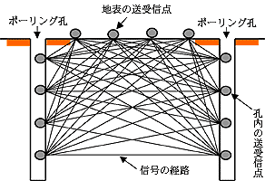 本方法は、図-1に示すように、地表、ボーリング孔および調査坑などに多数の発信点と受信点を配置し、孔-孔(坑)間および孔(坑)-地表間で物理探査的手法により計測を行い、インバージョン解析により物性分布を再構成するものです。探査に用いる媒体は、弾性波、比抵抗、電磁波などが実用化されています。