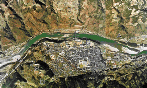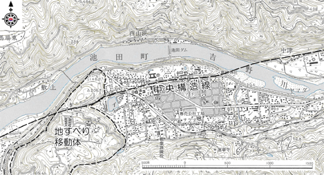 「池田町」の市街地は活断層に切断された河岸段丘面の上に発達している